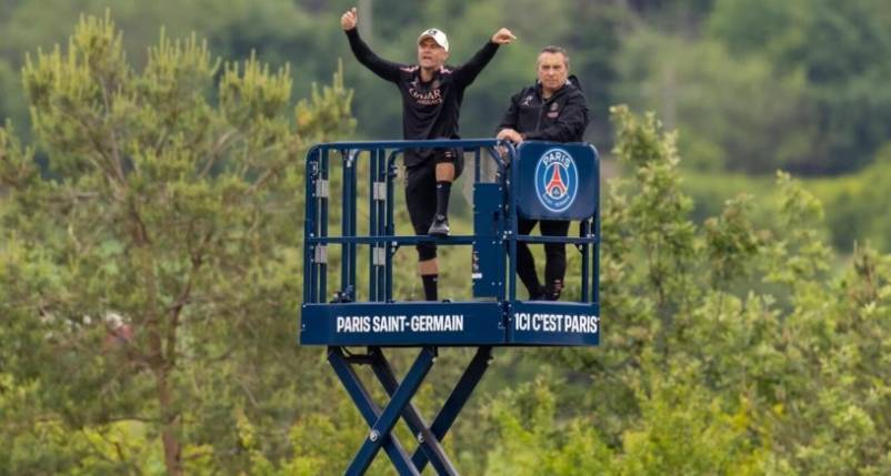 直播吧05月22日讯 据罗马体育报消息,巴黎圣日耳曼主帅在训练中站在6米高的升降台上指挥球队训练,备战欧冠决赛。